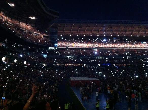 Más allá del imponente aspecto musical, que sin duda es la esencia y la clave del poderío de sus conciertos, el de Nueva Jersey convierte el rock en lo que debe ser: una celebración festiva y compartida y, al mismo tiempo, sensible hacia el sufrimiento de quienes lo pasan mal. «Queremos dedicar esta canción a Nacho y a su familia. Está en nuestras plegarias», dijo Bruce anoche en perfecto castellano antes de comenzar a tocar The river, satisfaciendo de esa manera los deseos del entorno de este joven que iba a asistir al concierto del Bernabéu pero que días antes perdió definitivamente la guerra contra el tumor cerebral que padecía. Gestos así honran a un músico que podría estar de vuelta de todo, pero que se sigue dejando la piel por agradar y ofrecer  sus seguidores el mejor espectáculo del que es capaz. Eso es lo que lo hace inmenso a él y muy pequeñitos a otros.