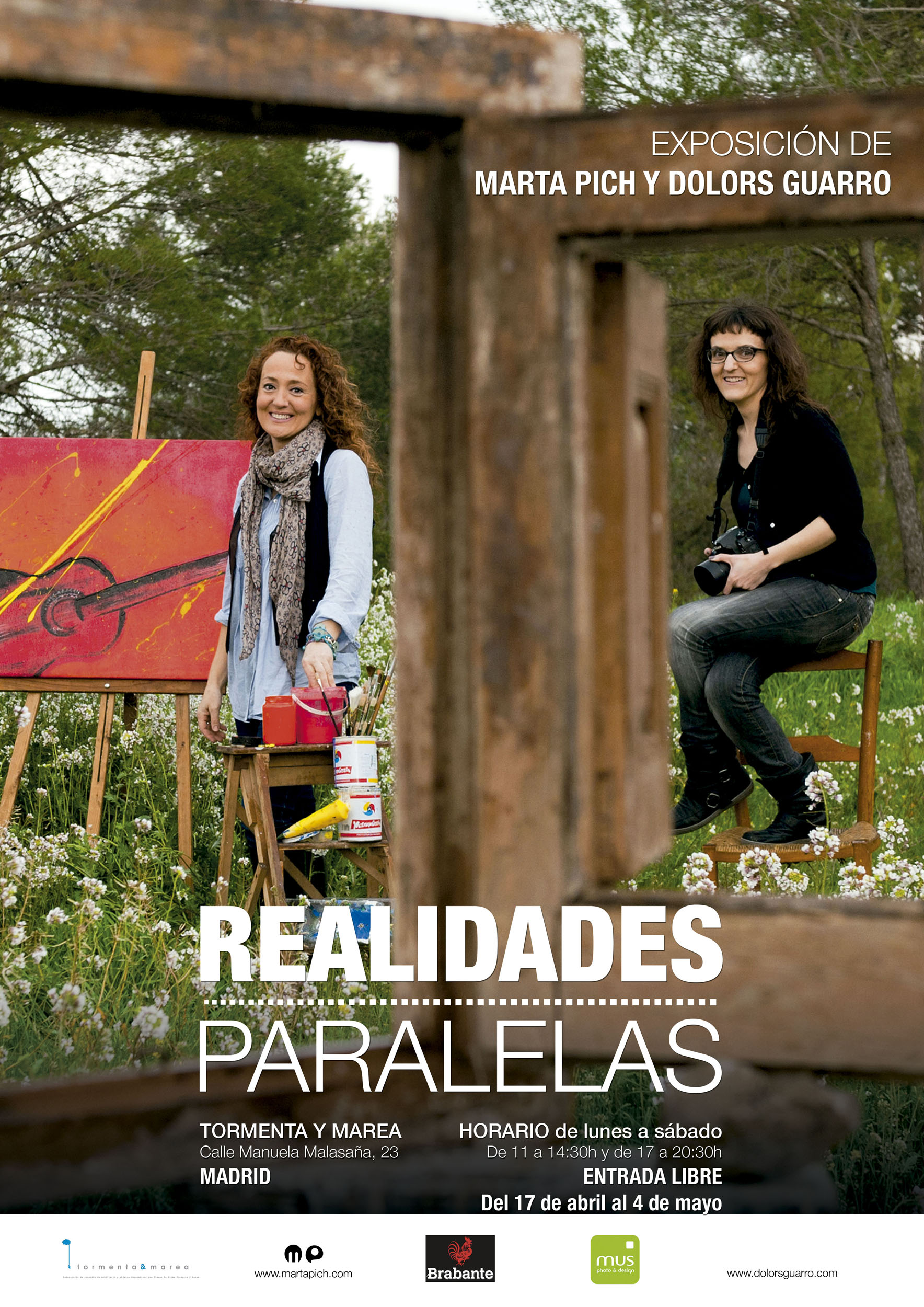 Cartel Realidades ParalelasY 15 de esas capturas son las que ha llevado a la exposición «Realidades paralelas», aunque eso no es todo. Inquieta y en permanente búsqueda, hace meses pensó que la pintura sería la acompañante ideal para sus fotografías. Por eso comenzó a enviarle a su buena amiga Dolors Guarro canciones determinadas, elegidas cuidadosamente por ella por su significado especial, para que la artista plástica (que en la mayoría de los casos no las conocía) expresara sobre un lienzo todo aquello que cada una le inspirara. Así, temas como Te espero, de Antonio Vega, La próxima montaña, de César Pop, Inestable, de Jorge Marazu o Aunque tú no lo sepas, de Quique González, dan forma a una exposición original en la que las instantáneas de cantautores o grupos musicales en blanco y negro contrastan con la explosión de color de las pinturas. Al lado de cada doble obra aparece impresa la letra de la canción que la inspiró. Dos realidades artísticas paralelas unidas a través del nexo universal que es la música.