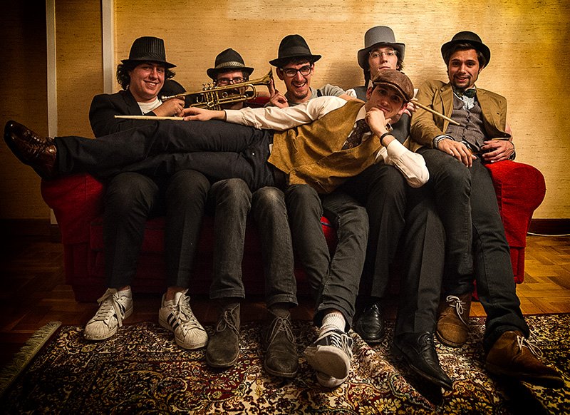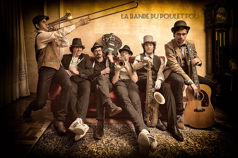 Guillermo Arias (saxo), Cristóbal Iglesias (trombón y trompeta), Charly García (batería), Fer Marín (guitarra), Jaime Martínez (piano y voz) y Pablo Elías (bajo) son La Bande du Poulet Fou, un nombre francés elegido de manera tan arbitraria como Napoleón designó a su también gabacho hermano José como Rey de España. En su caso se conocieron en 2010 en un curso de jazz en Gijón y desde entonces no han parado de ensayar, grabar maquetas y tocar allá donde les han dejado, «incluso en sitios que avergonzarían a una persona decente», reconocen. En estos años han sido finalistas en certámenes musicales como el que organiza en Asturias Los 40 Principales o el Festiamas, han «cartografiado todas las salas de música del Oviedo antiguo» y se han preguntado dónde están escritas, si es que lo están, las leyes del rock’n’roll.