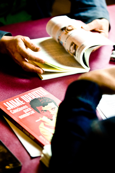 Jaime10Este es un libro para leer con el Spotify a mano… Pues sí, mira el otro día estuve en Sevilla con un amigo que me dijo precisamente eso, que se lo estaba leyendo con el Spotify. Incluso en Larousse, la editorial, habían pensado en hacer una lista con todas las canciones. Sí, es un libro muy para eso, para escuchar la música según lo lees, porque hay muchas referencias.