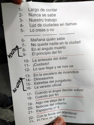 En la escalera de incendios, Dinosaurios, Estrellas del Purgatorio y La versión oficial, todas ellas canciones de El alma dormida, inician el bloque de la segunda parte del concierto, con Lapido refugiado tras la guitarra acústica. Después, ya armado con la eléctrica, encara Cuando el ángel decida volver y una versión a máxima potencia de Cuando por fin, con la que la banda abandona el escenario por primera vez.
