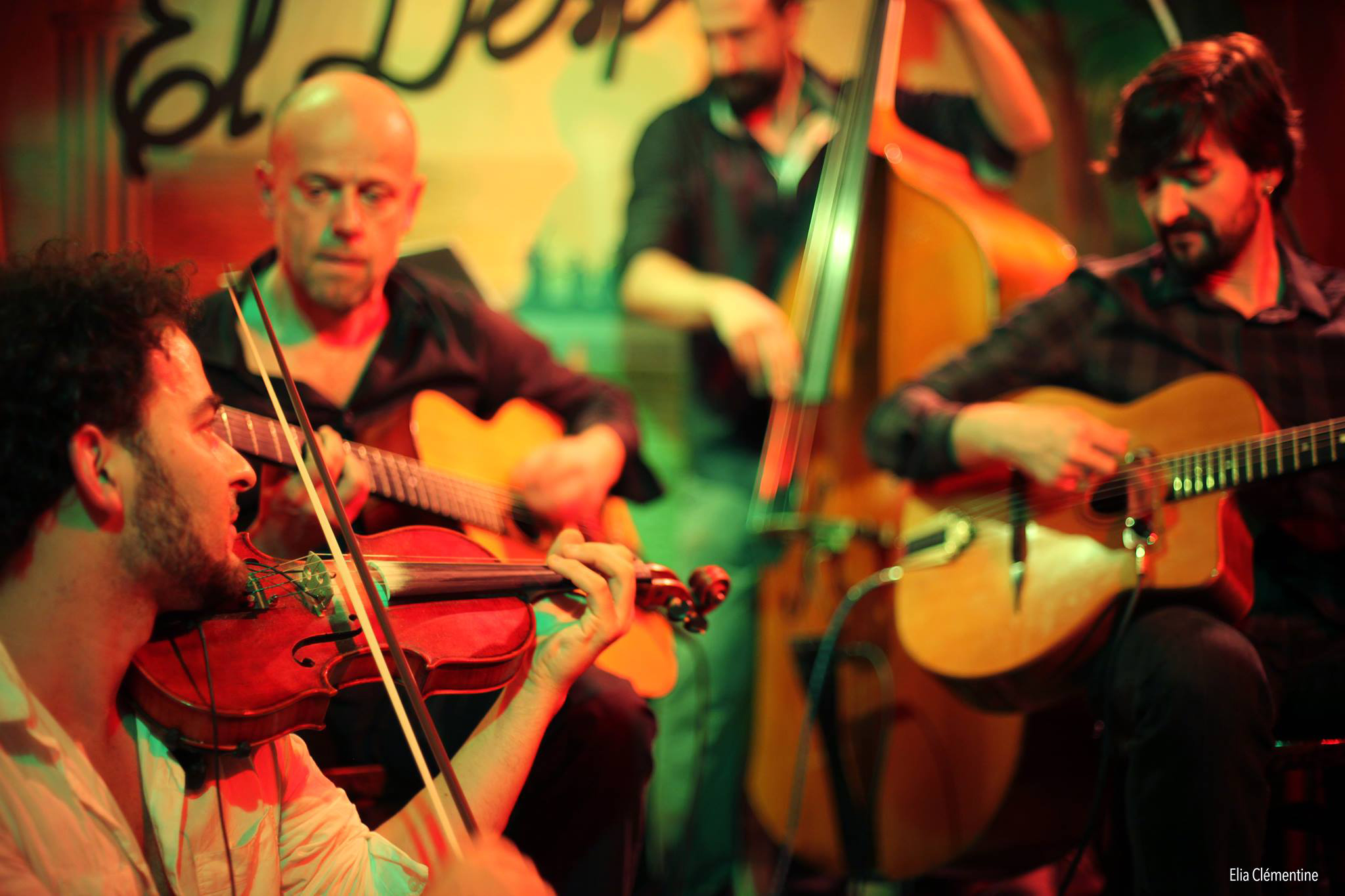 El punto más elevado de París, el más cercano al cielo, se encuentra en el distrito de Ménilmontant. De esta zona de la capital francesa toma su nombre la agrupación formada por Javier Sánchez (guitarra solista), Fred Pierre Gustave (guitarra rítmica), Gerardo Ramos (contrabajo) y Raúl Márquez (violín). Cuatro músicos de procedencias geográficas diversas pero habitantes todos ellos del amplio universo jazzístico. Un día se reúnen para formar Ménilmontant Swing con el propósito de difundir la música manouche, un género afincado en el terreno del swing que sigue siendo poco conocida, a pesar de que siempre es muy apreciada por el público cuando la escucha en directo.